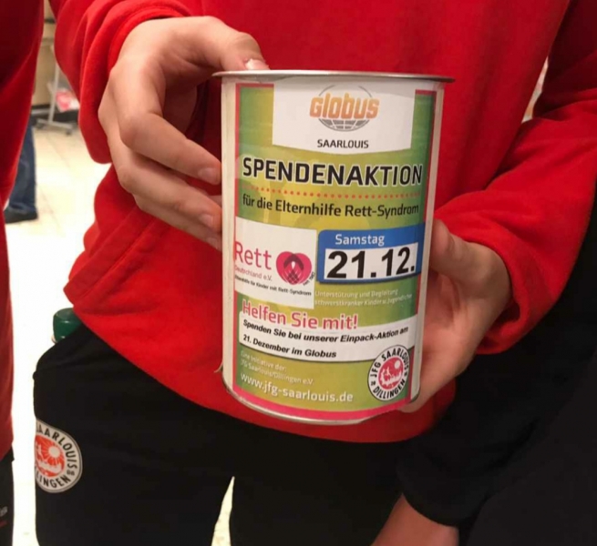 Spieler*innen der JFG helfen gegen eine freiwillige Spende den Kunden des Globus Saarlouis dabei, die Waren vom Band in den Einkaufswagen zu legen. Die gesammelten Spenden kommen in voller Höhe Rett Deutschland e.V. - Elternhilfe für Kinder mit Rett-Syndrom zu Gute.